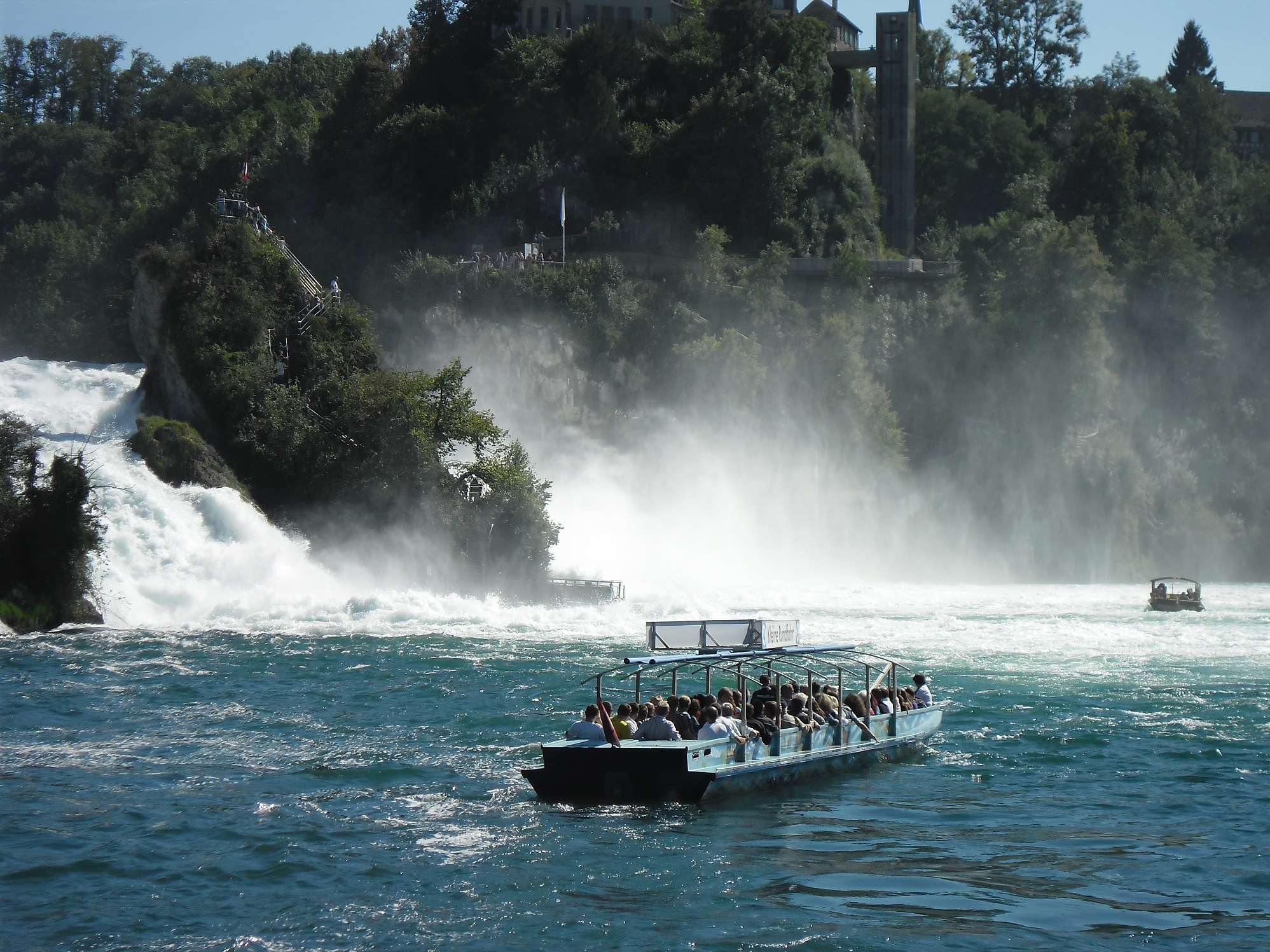 Al centro si erge una possente roccia che da millenni costringe la potenza degli elementi ed è raggiungibile con un giro panoramico sul Reno che permette di assaporare lo spettacolo naturale a distanza ravvicinata. Quasi al centro delle Cascate si può sostare anche sulle piattaforme costruite parzialmente al di sopra del Reno. Con il battello sono raggiungibili i Castelli di Wörth e di Laufen, a disposizione degli audaci c'è addirittura un noleggio di canoe.